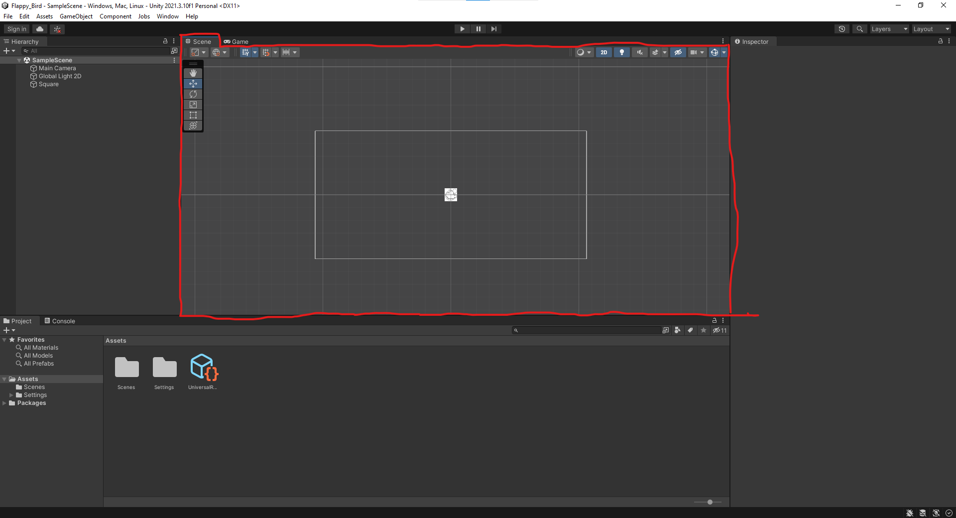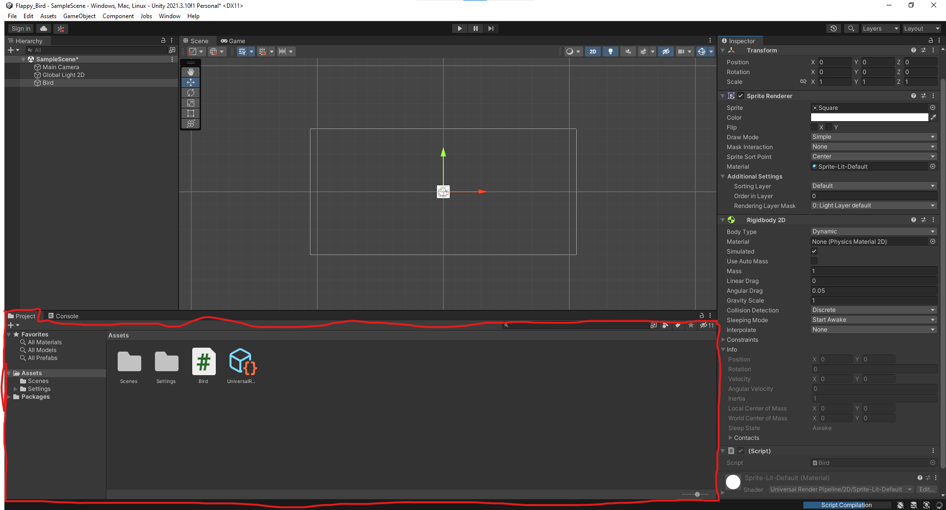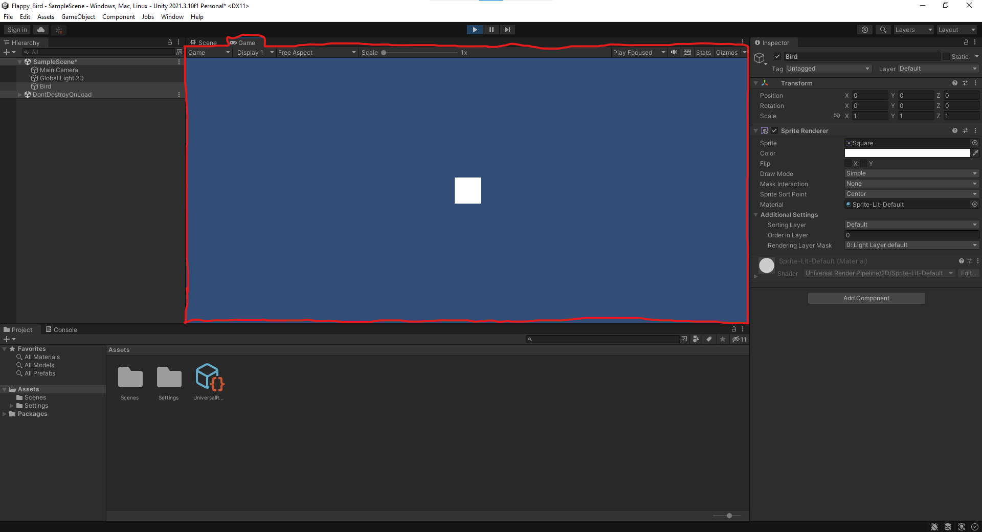 Note: You can change the name of our bird GameObject from “Square” to something more descriptive by changing the name field at the top of the inspector panel.