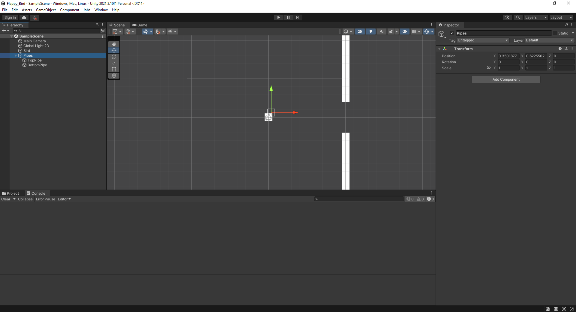 For the pipes, let's make two square sprites. We'll elongate them by tweaking the y component of the scale field inside of their transform component. Make sure that there's some space between them for the bird to fit through - you can tweak their positions by selecting them and dragging the arrows that pop up in the scene view. Aim to end up with something like this: