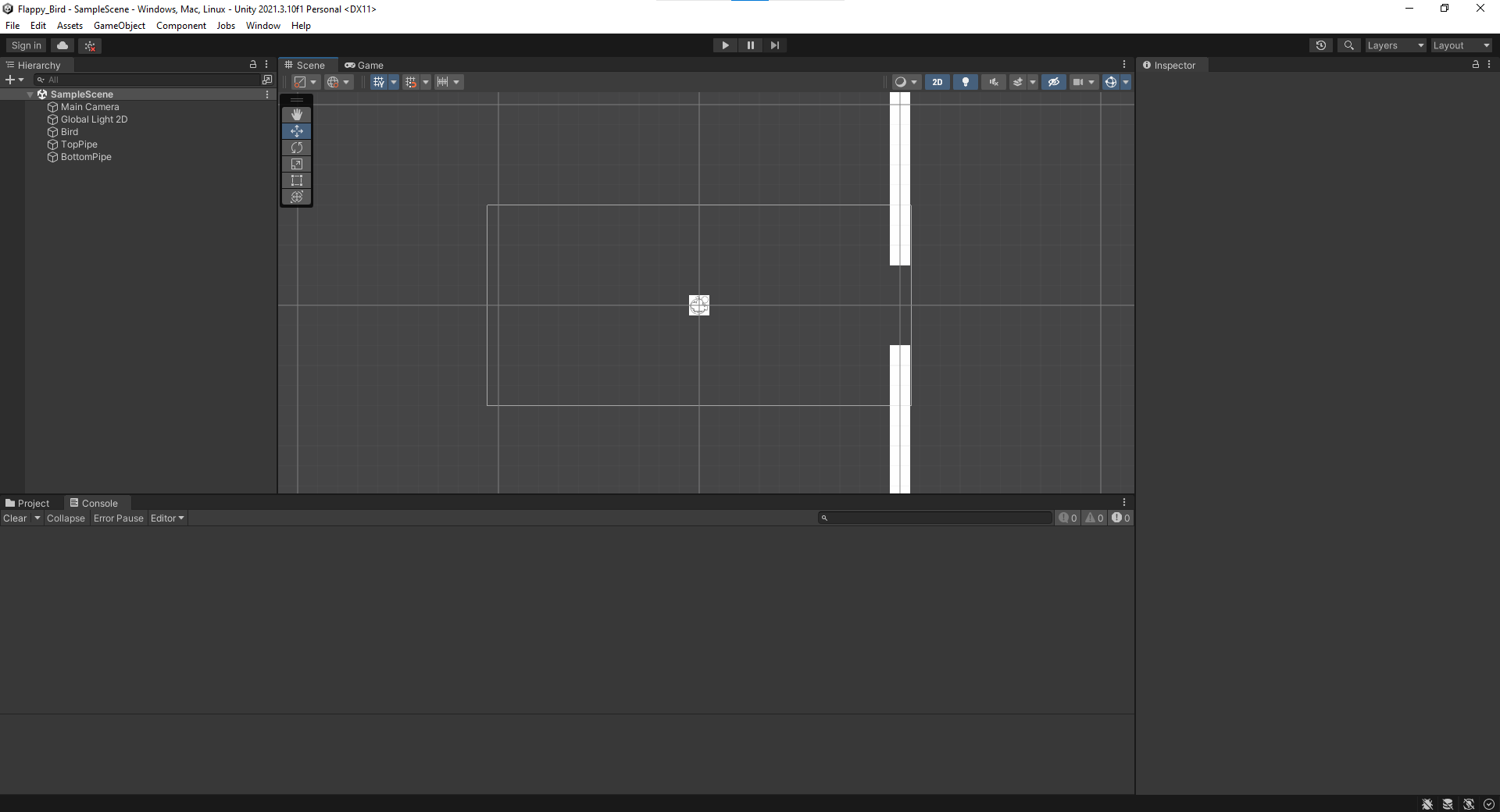 You may notice that our bird can go right through the pipe! We can remedy this by adding Box Collider 2D components to all of our sprites. The box collider will define the area within your sprite that cannot pass through other sprites. Your result should look something like this