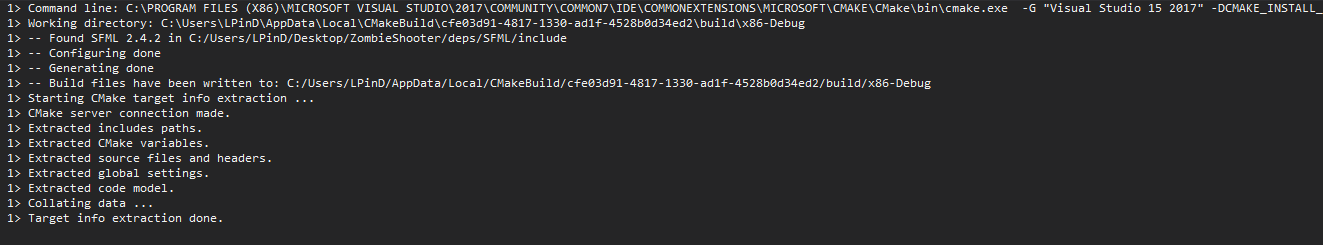 Visual Studio should detect the CMakeLists.txt file. It prints the CMake log into