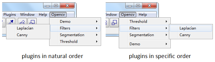 Now OpenCV menu is before the Help, and the Threshold is the first Item, then Filter, Segmentation, last is Demo. and if we put '-' in catlog, It will be parsed as a spliter line.