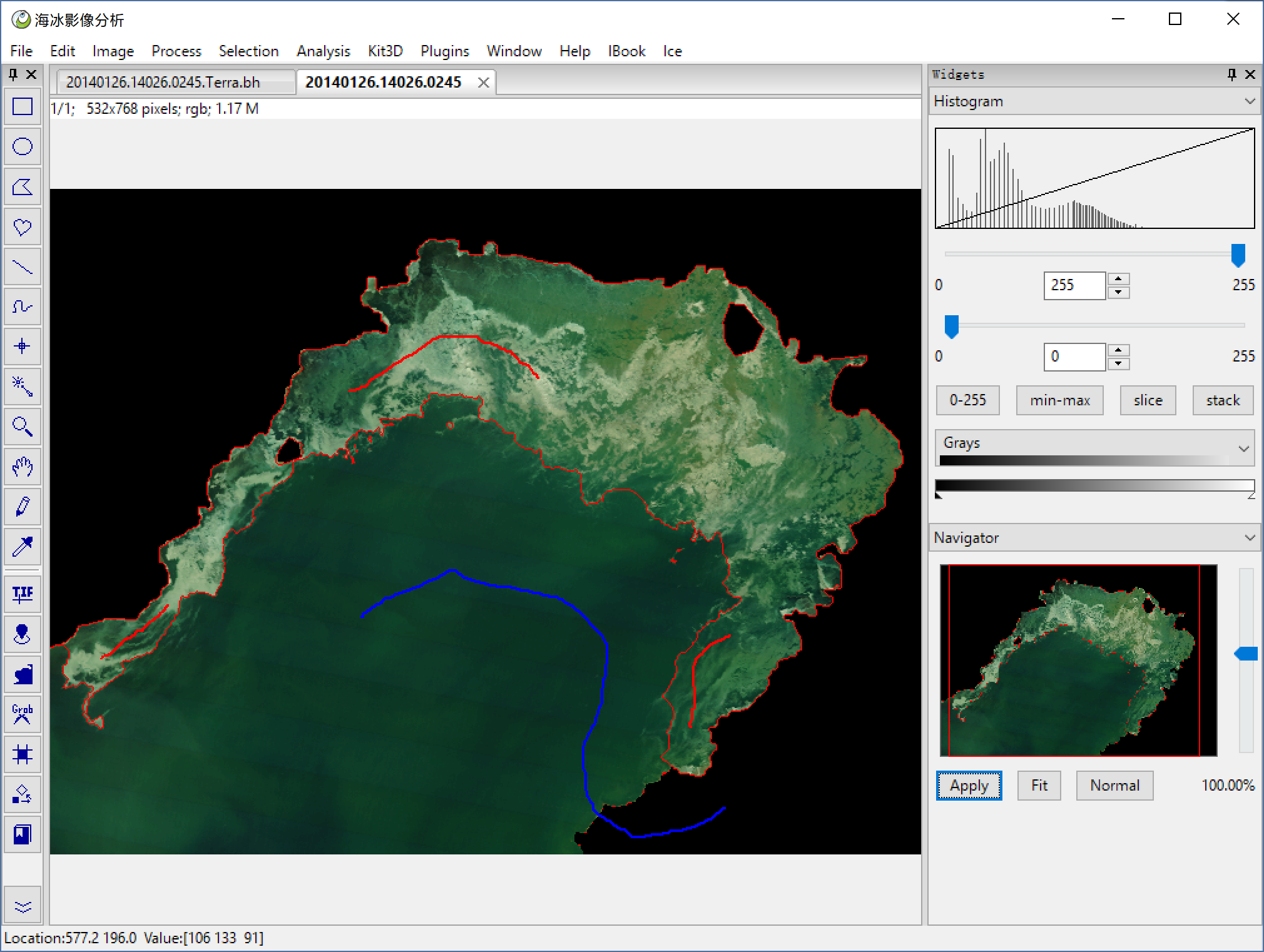 Grab Tool which has a scissors icon, this tool is a wraper with opencv's grabcut, move mouse, use left key to mark the ice(red), and left key to mark the water(blue) then click left key with ctrl pressed we can got the red edge, this is our segmentation result.