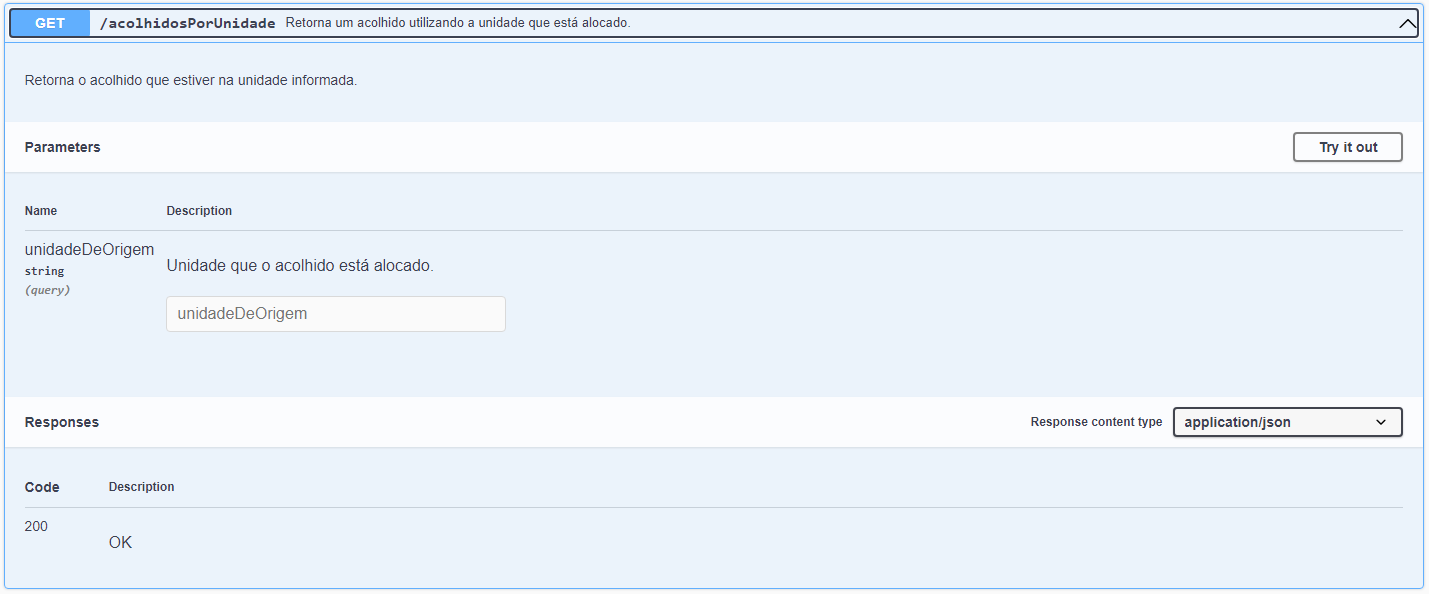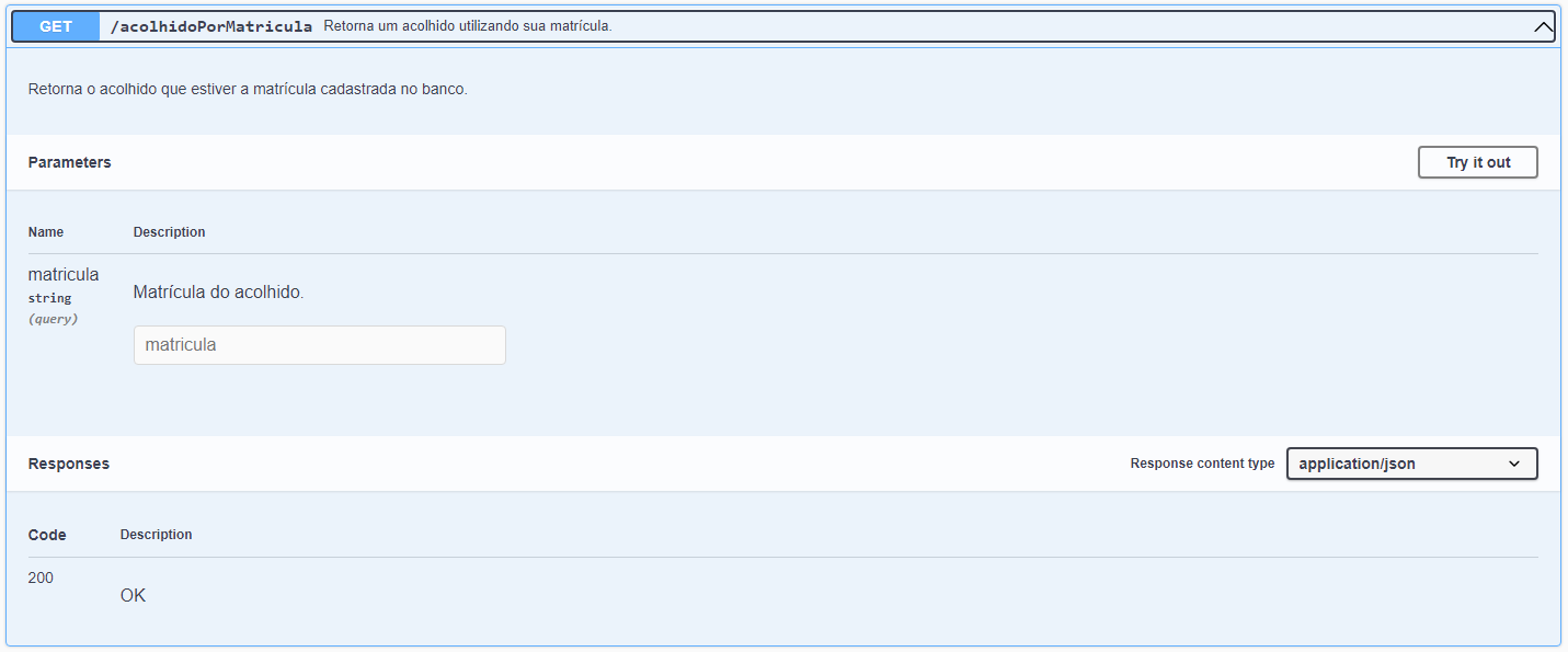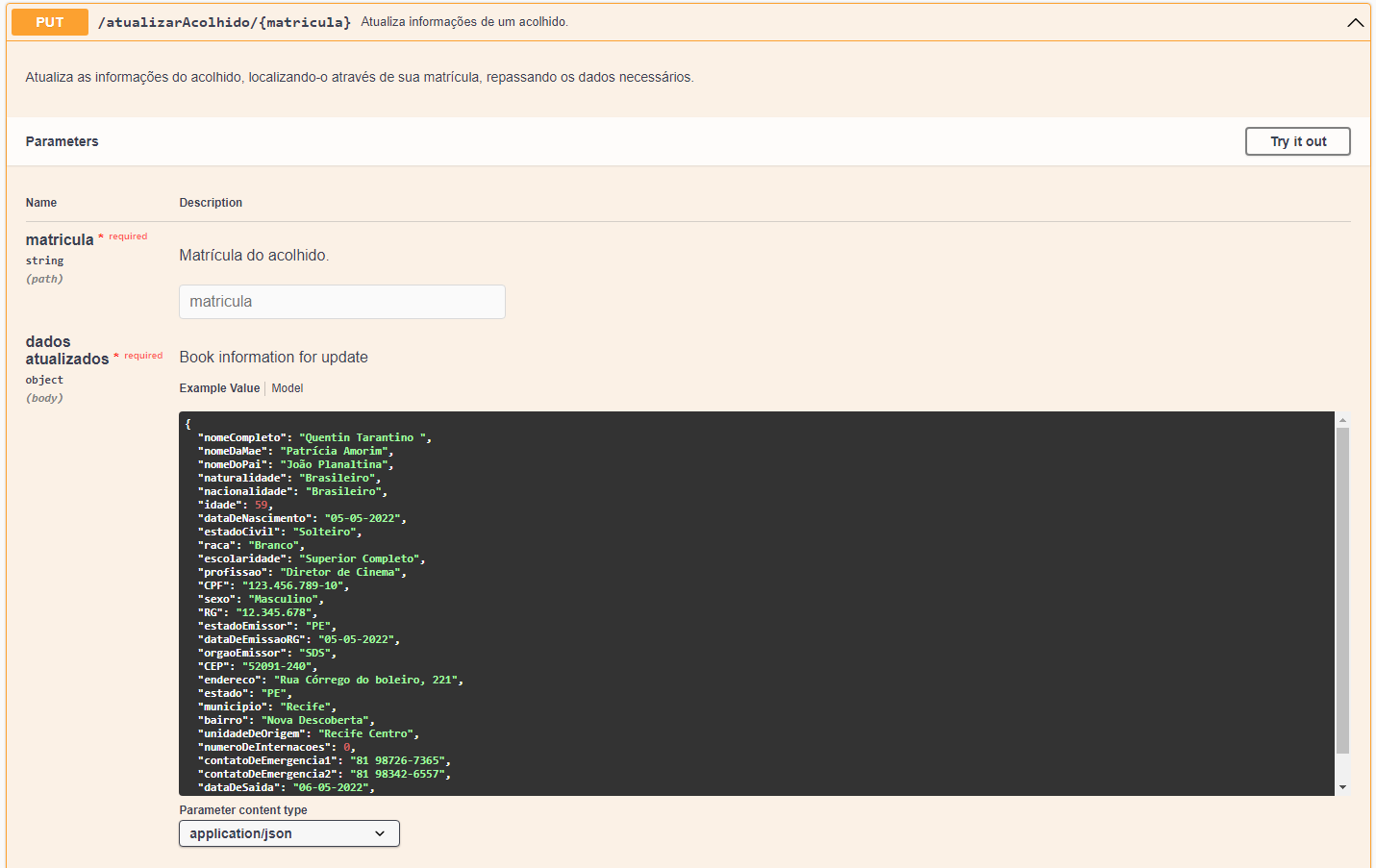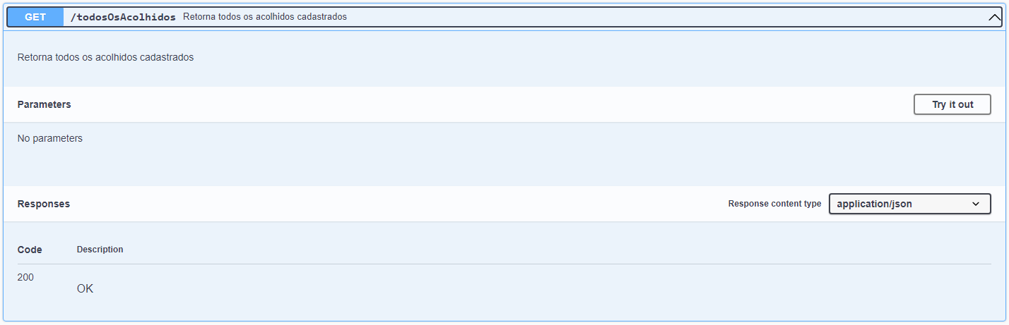 jsonpara inserção dos dados. Dentro da aplicação recebe um objeto javascript que é convertido automaticamente parajson - Cadastra os acolhidos com as informações fornecidas. Por padrão o