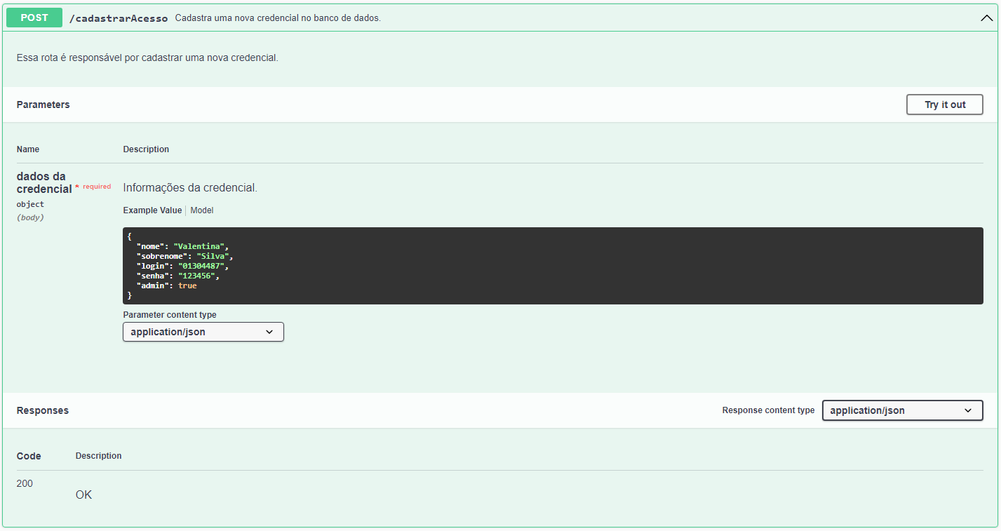 { valido: true }caso a credencial esteja correta ou{ valido: false }para incorreta.