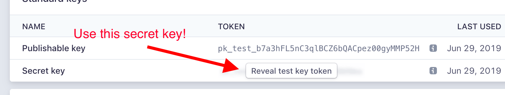 Remember to add a file called .env to the root folder! In that .env file remember to add a STRIPE_SECRET_KEY value equal to your own secret key from your stripe dashboard. You can find it in the same place where you found your publishable key in the developers tab under api keys. You will have to enter the password in to reveal it!