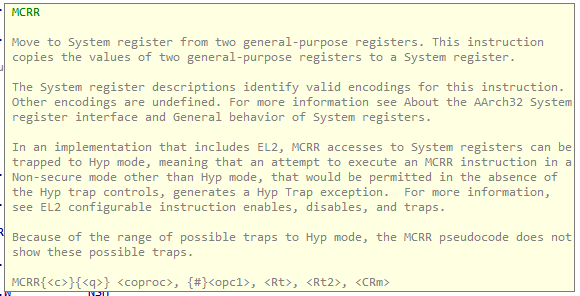 Hovering over a system register in the IDA View subview or in the Pseudocode subview will display a summary (usually kept under 30 lines) of the relevant documentation page, including the bitfield when available.