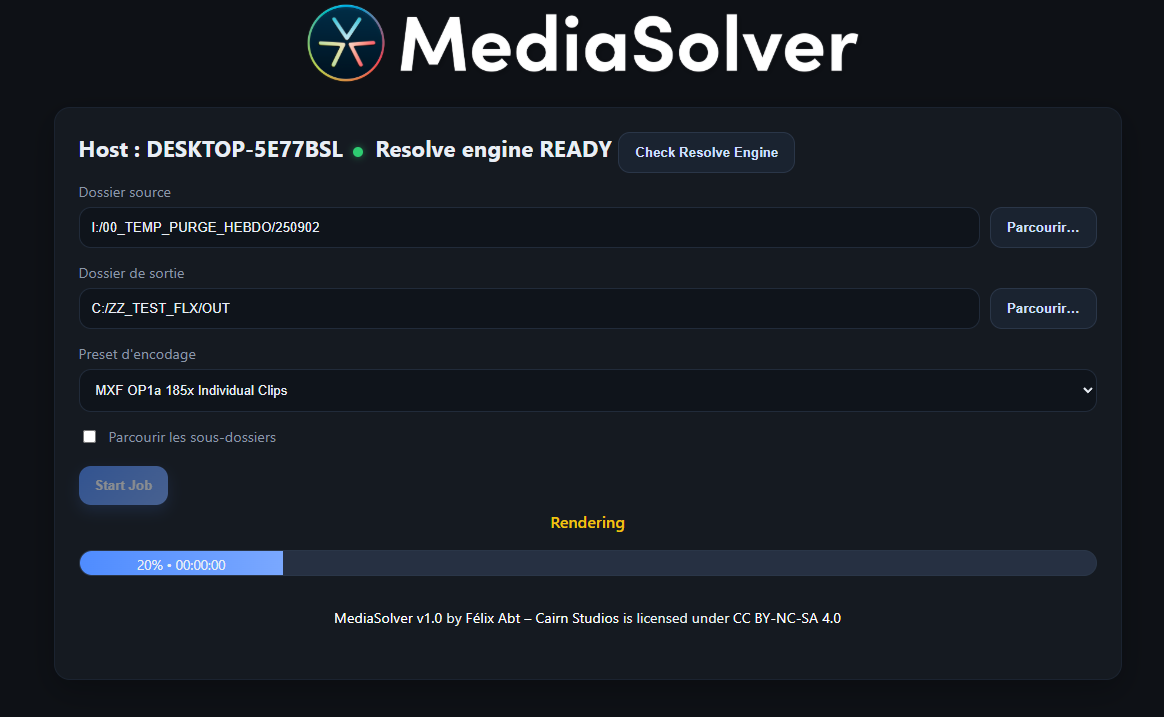 Ensures Resolve is running, the API responds, and the MediaSolver project is loaded, so the job is ready to render. Handles unnamed (unsaved) projects, automatically creating or loading MediaSolver if needed, and returns a detailed status (OK, APP_OFF, LOAD_FAILED…). Ingest/render pipeline launched in a thread: Can be executed whith the "Check Resolve Engine" button directly on webUI