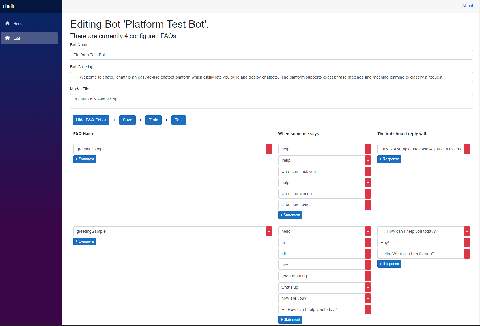 You may also load the editor page which allows you to customize frequently asked questions (with custom conversations coming soon!) as well as view the sample ones that were created. If you decide to make any changes, press the "Save" button then "Train" to train the bot on your changes. Lastly you can navigate back to the Home screen to chat with your newly trained version.