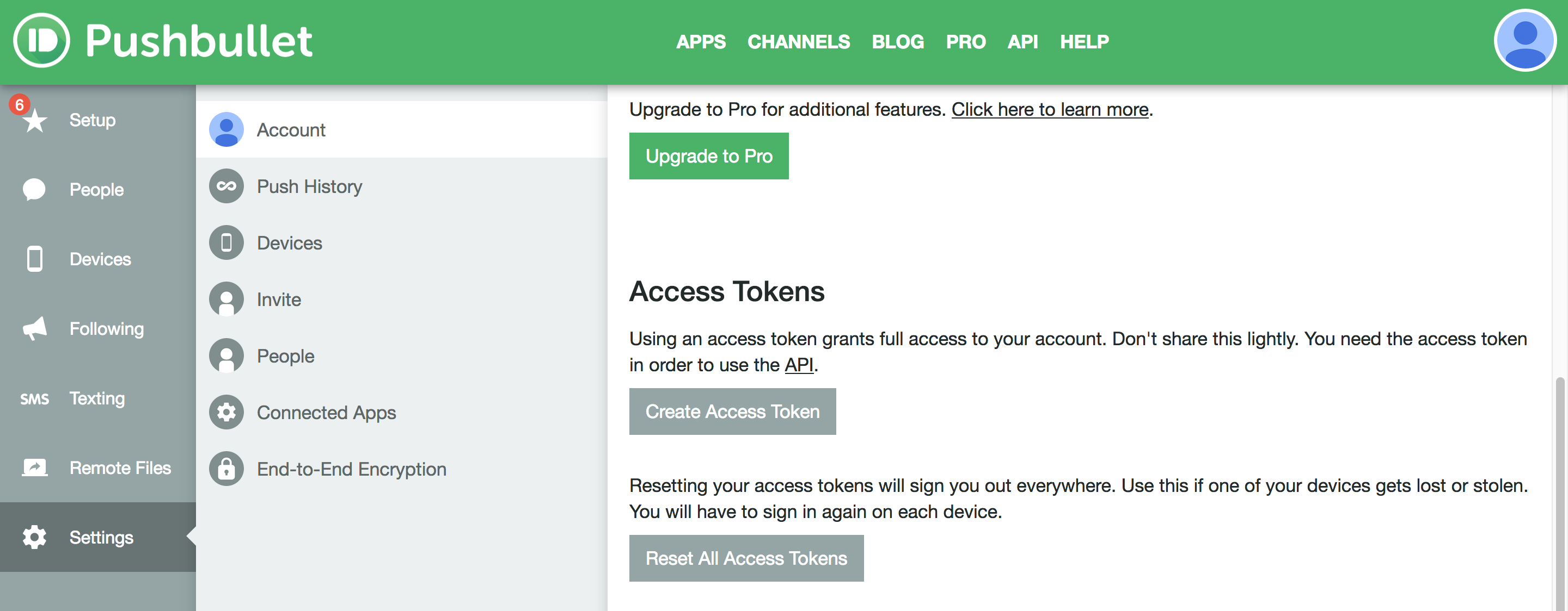Create your Pushbullet access token by going to your Pushbullet account settings