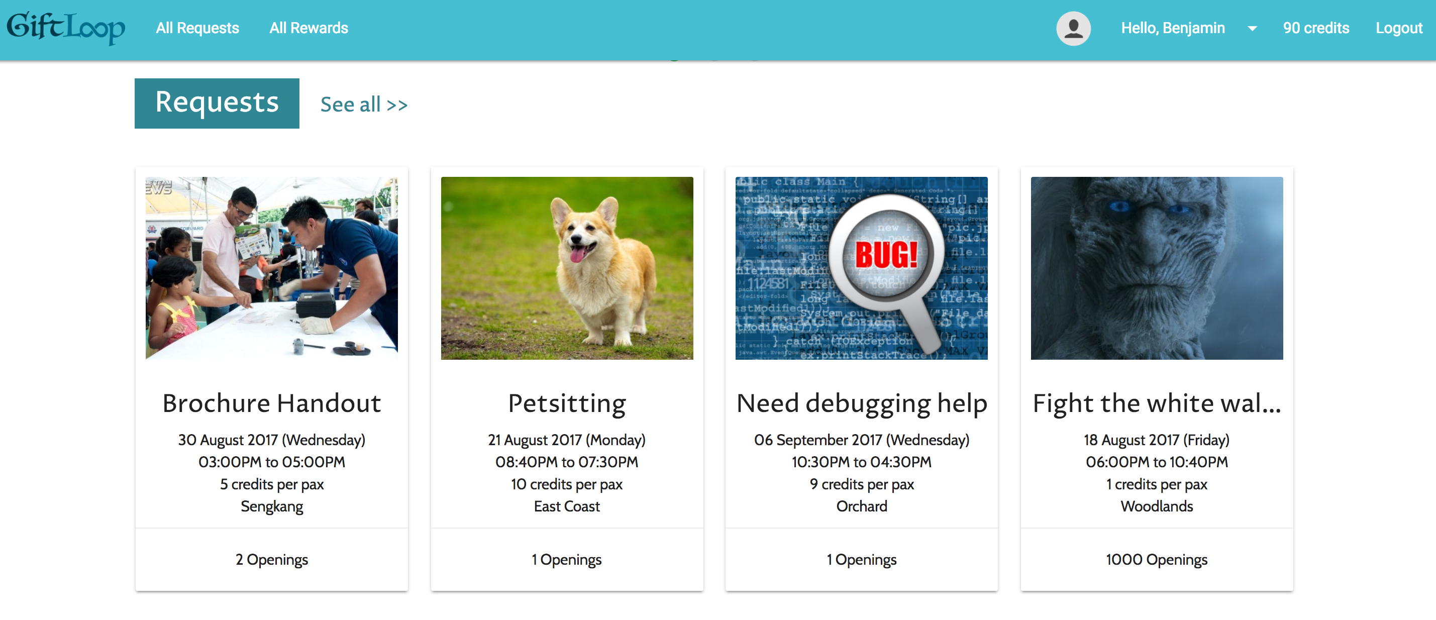 We want to enable Singapore to be a society where people volunteer for social causes, as well as help one another out in time of need. Instead of money, we will be using a digital currency called time credits. Organisations start out with 1000 time credits and can create requests to get volunteers for social causes, but will also have to give back by offering rewards like art classes. Individuals start out with 0 credits and will build up their credits by first volunteering for organisational events or helping other individuals out.