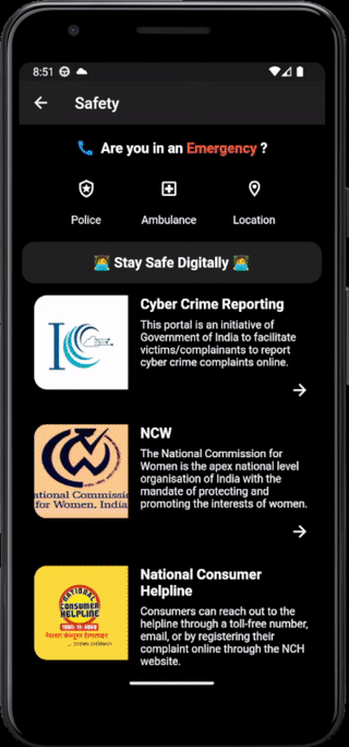 β‘οΈ After a classmate faced a risky situation online due to limited knowledge about digtal security, we also decided to implement a Safety Section where our users can learn about best methods to be digitally secure and also access SoS features when needed.