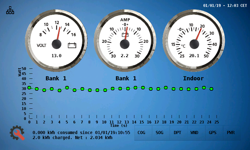 Environment : Page with Voltage, Current, Temp and Power plotting (proprietary NMEA net "$P" sentences)