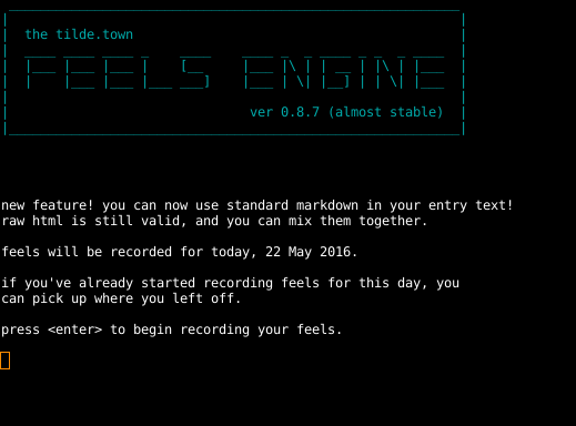 (nopub)will not get written to html or gopher, and toggling them from this menu will immediately publish or unpublish that entry (if you're not publishing your posts at all, these settings won't matter, since your feels will never show up outside of tilde.town) - backup your feels--makes a .tar.gz of all your entries, saving one