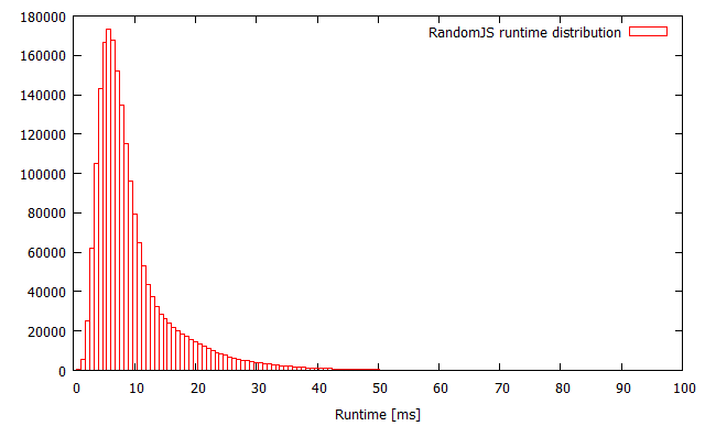 The distribution was calculated from 2 million random programs on a 3.7 GHz Intel Xeon E3-1245. Total of 158 programs had runtime over 100 ms.