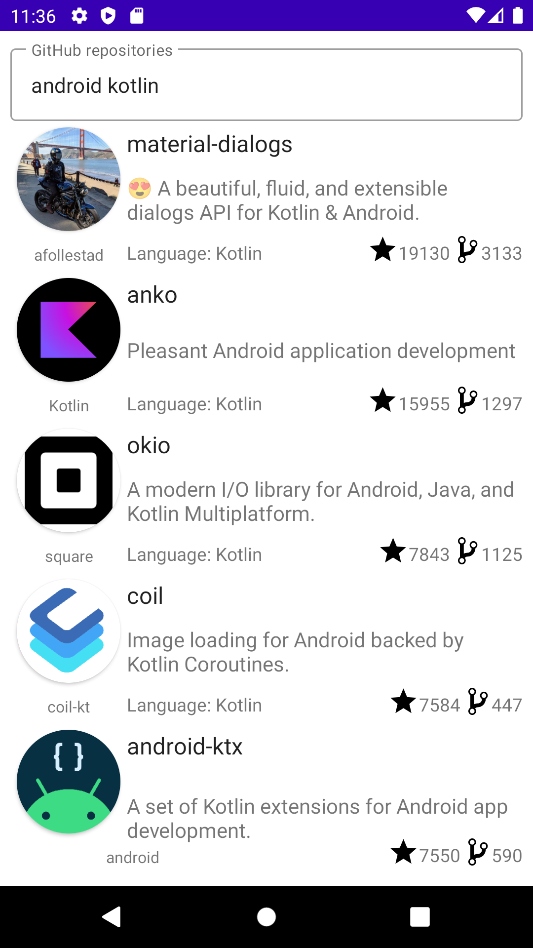 GitHub client sample project encompasses best practices and recommended architecture for building robust, high-quality Android mobile apps. It's following MVVM as architectural pattern. Moreover, adds the Clean Architecture concepts to separate domain logic.