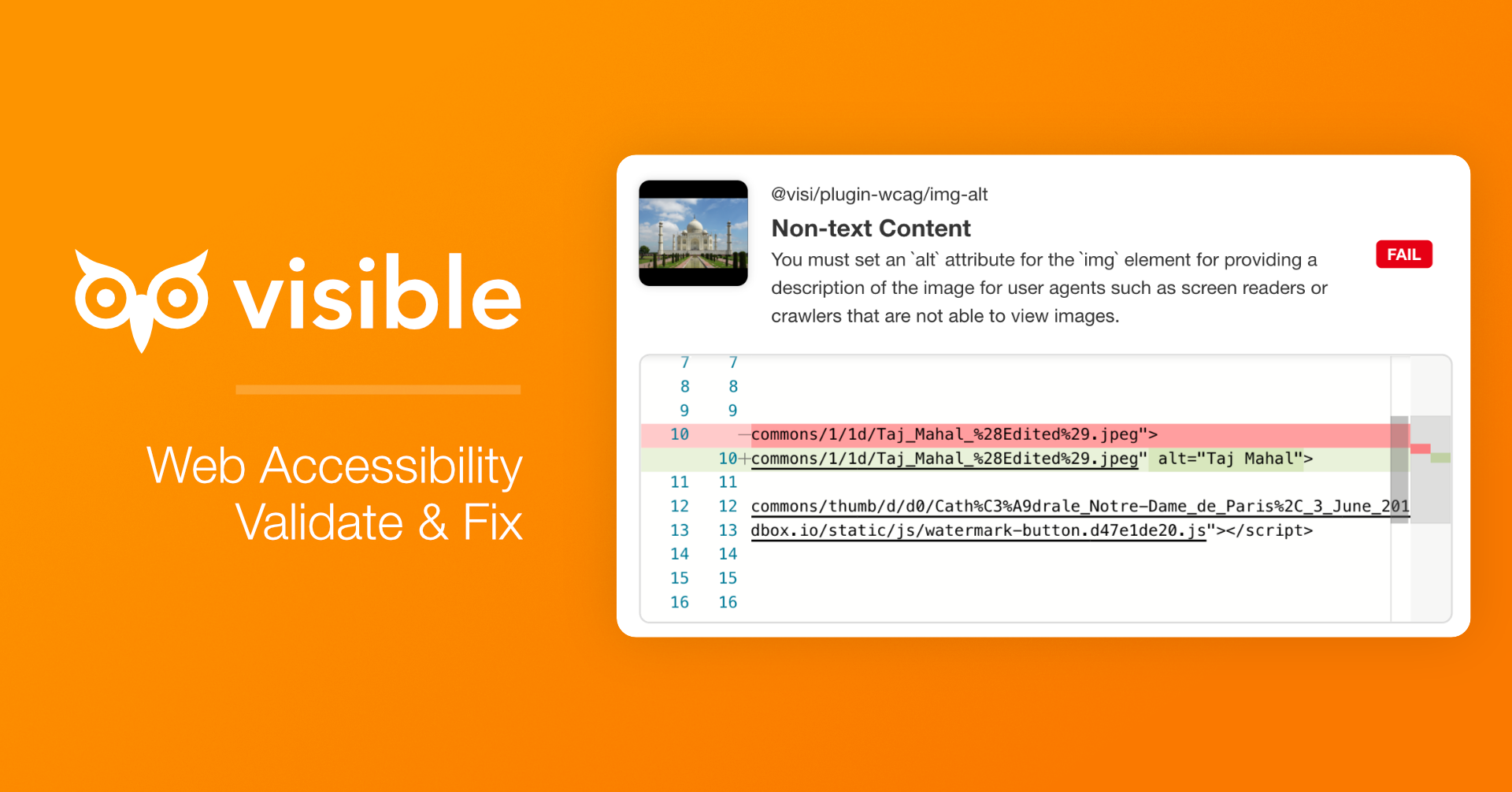 - π Validation β Visible can run fully automated validation based on the web standard ACT (Accessibility Conformance Testing) just by putting the URL. The result always comes out with highlighted codes and detailed messages so you can immediately start fixing the problem.